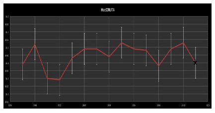 The graph shows the global annual average temperature since 1997. No statistically significant trend can be discerned from the data. The only statistically acceptable conclusion to be drawn from the HadCRUT4 data is that between 1997 – 2011 it has remained constant, with a global temperature of 14.44 +/- 0.16 deg C (2 standard deviations.)