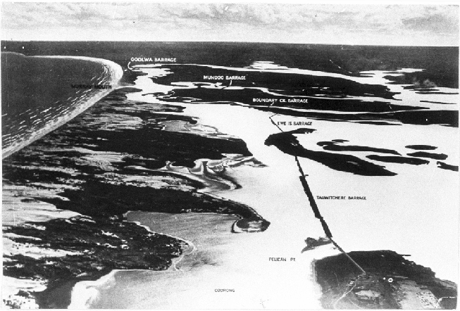 “The position of the channel at the mouth is governed principally by the ocean… During the great 1956 flood, the highest ever recorded on the lower Murray, the river outlet, although wider and deeper than normal, was situated in the easterly section of the overall movement pattern and was in a similar position as the situation of the mouth during the dry year of 1914.