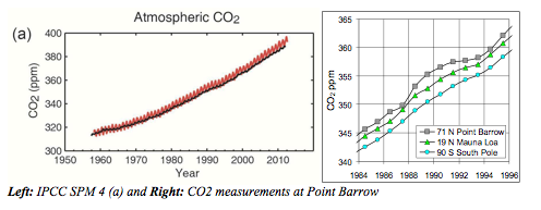Left: IPCC SPM 4 (a) and Right: CO2 measurements at Point Barrow. Click on the image for a better view.