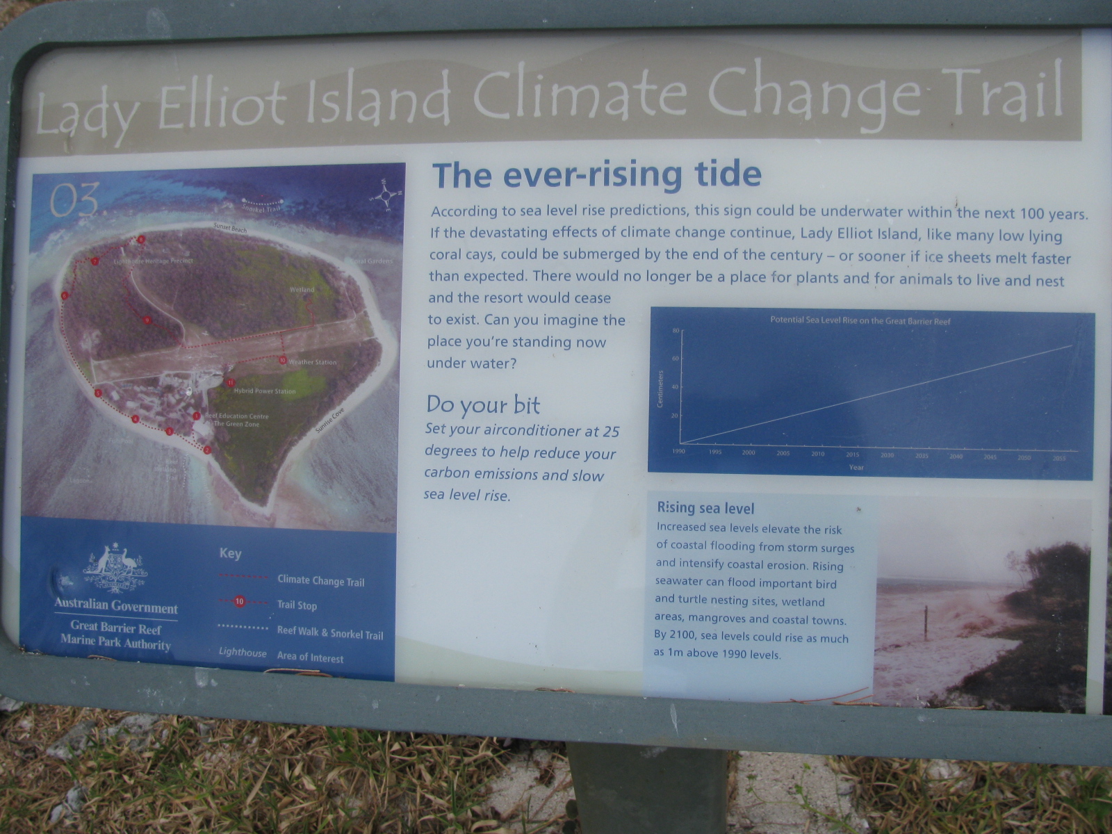 Dear Jennifer, I had a holiday on Lady Elliot Island in October 2013 and while there took the attached photos with the idea that I might send the one of the climate change sign to an Australian blog as an example of Federal Government alarmist propaganda.