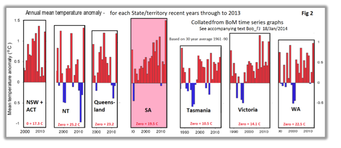 4. While much has been made of January 2013 being exceptionally hot, when the mean January temperature anomaly is plotted for South Australia back to 1910, Chart 4, it is apparent that 2013 was not an exceptionally hot January with hotter January’ occuring in the 1930s.
