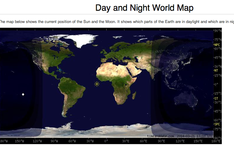 The map shows the position of the sun and the moon relative to the earth at about the time I made this blog post. The day and night world map can be accessed by clicking here… http://www.timeanddate.com/worldclock/sunearth.html