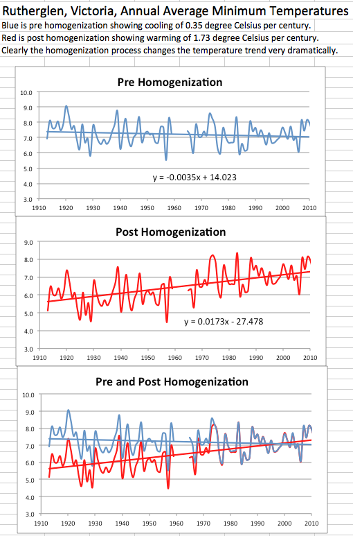 That the Minister has not yet intervened, and that many within the Australian scientific community attempt to justify the practice of homogenisation that creates these ‘adjustments’ that changes cooling trends to warming trends at a whim, is reason for national shame. It all amounts to corruption of the scientific process on a grand scale, with significant economic implications. But not even a whisper about the scandal can be heard from the Australian national broadcaster or the many other typically righteous institutions and individuals that claim to be motivated by the truth.