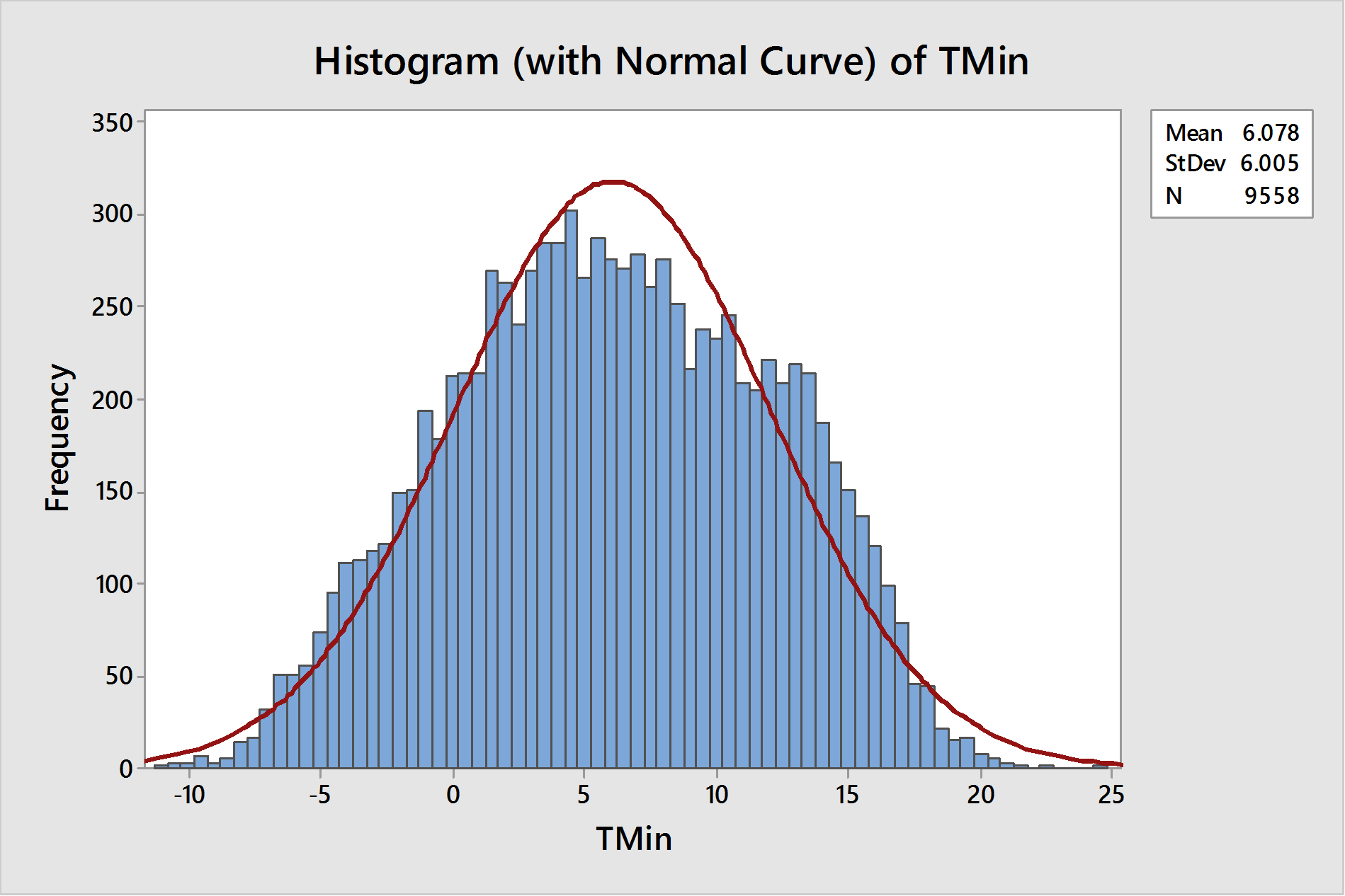 I have an old book of climatic averages published by the BoM. It states that a good estimate of the lowest expected temperature is average minimum minus 2.8 times the difference between the average and the 14 percentile. For July at Goulburn Airport the relevant figures are average is 0.5C and the 14 percentile is -4.4C. Using this gives a lowest expected temperature of -13.2C. One could understand using such a formula as a flag for quality checking but -10C seems to way too warm. The correct way to model this is to set a checking limit on the basis of a one in 100year event. There are 3,100 July days in 100 years. The z score here would be -3.44 corresponding to a cumulative frequency value of 0.0003 and would equate to a value of -13.6C.