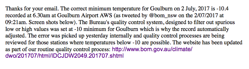 In particular, the Minister was told that while the Goulburn weather station accurately measured the local temperature as minus 10.4 at 6.30 am on Sunday 2 July, a smart card reader prevented this value from being recorded as the daily minimum on the Daily Weather Observations page.