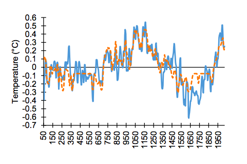 The IPCC comes up with a very different assessment because they essentially remodel the proxy temperature series, before comparing them with output from General Circulation Models. For example, the last IPCC Assessment report concluded that,