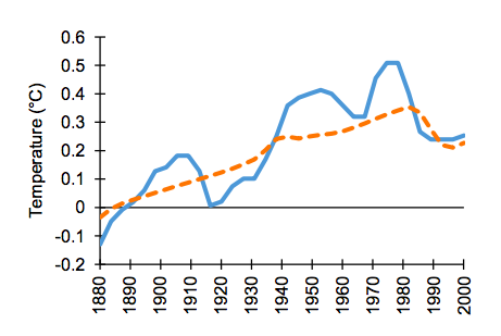 Figure 13 from our new paper in GeoResJ shows the extent of the match between the proxy-temperature record (blue line) and our ANN forecast (orange dashed line) from 1880 to 2000. Both the proxy record and also our ANN forecast (trained on data the predates the Industrial Revolution) show a general increase in temperatures to 1980, and then a decline.