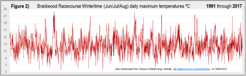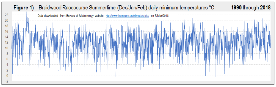 However, that would be an eight-degree rise per century, or implausibly about eight times greater than the Australian average as stated by the BoM’s Dr Braganza at 5 video-minutes. Also, the BoM data show no discernible warming trend in the summertime maxima at the racecourse (figure 2).
