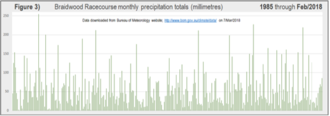 However, the available BoM rainfall data for the Racecourse reveals no discernible rainfall reduction trend since 1985 and nothing unusual in annual variability apart from a drier period in the 1990’s (figure 3).