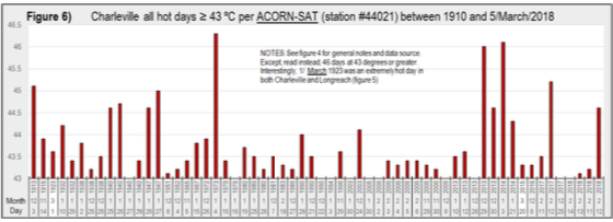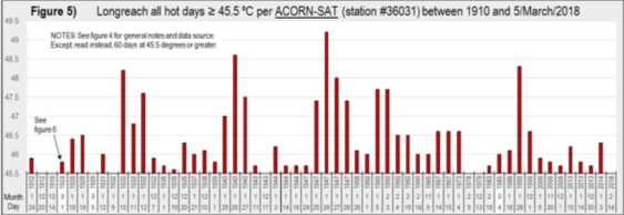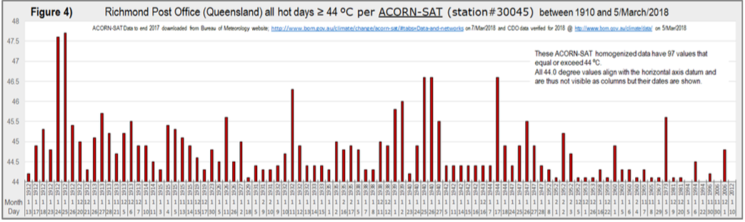Mistakenly, the forecaster’s statement about Richmond is strongly contradicted in figure 3, and, although the stated 45.5 in 2018 is apparently OK, one of the corrective BoM tweets on the saga in 2.1 above admitted that it was 2.3 degrees hotter in 1939. Also, the Winton, Roma and Toowoomba examples only have short records that are incapable of providing long-term trend determinations. Moreover, Winton’s 45.5 in 2018 did not break the record high of 46.9 on 1/Dec/2006 anyway!