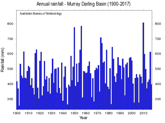 An underlying theme of the Four Corners program is that the general situation across Australia is one of declining rainfall. In fact, while the overall trend for south western Australia, the example provided in the program, may be one of decline, in many other areas there has been record high rainfall over the last decade. For example, the highest recorded annual rainfall total since 1900, for the Murray Darling Basin, was in 2010.