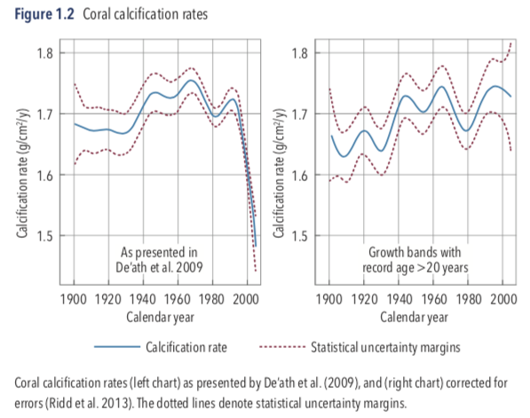 However, I have two issues with their analysis. I published my concerns, and an alternative analysis, in the journal Marine Geology (Ridd et al. 2013). First, there were instrumental errors with the measurements of the coral layers. This was especially the case for the last layer at the surface of the coral, which was often measured as being much smaller than the reality. This forced an apparent drop in the average calcification for the corals that were collected in the early 2000s – falsely implying a recent calcification drop. Second, an ‘age effect’ was not acknowledged. When these two errors are accounted for, the drop in calcification rates disappear, as shown in Figure 1.2.
