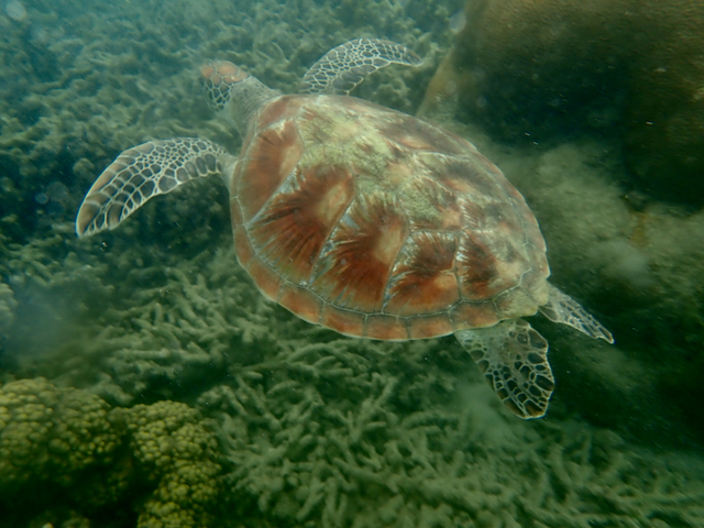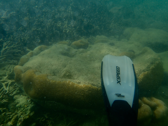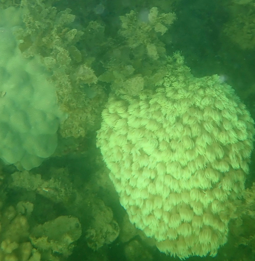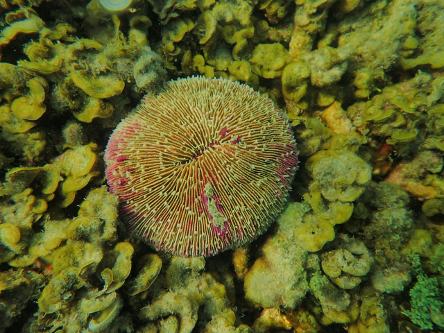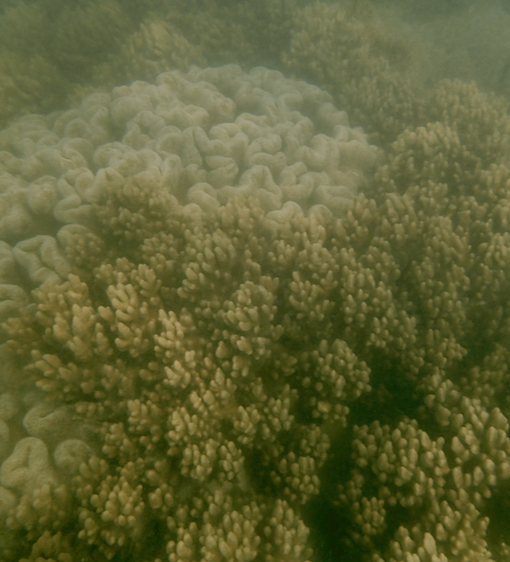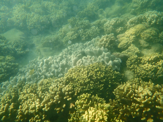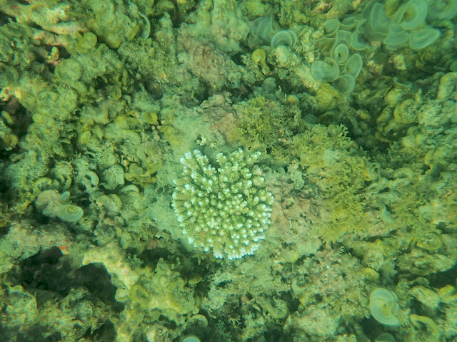 As I snorkeled sometimes the backdrop was broken coral. Other times I swam over meadows of algae. But I never had to swim far before seeing something special – like a mushroom or staghorn coral. They were often solitary: the very early stages of regeneration at an otherwise often ugly reef.