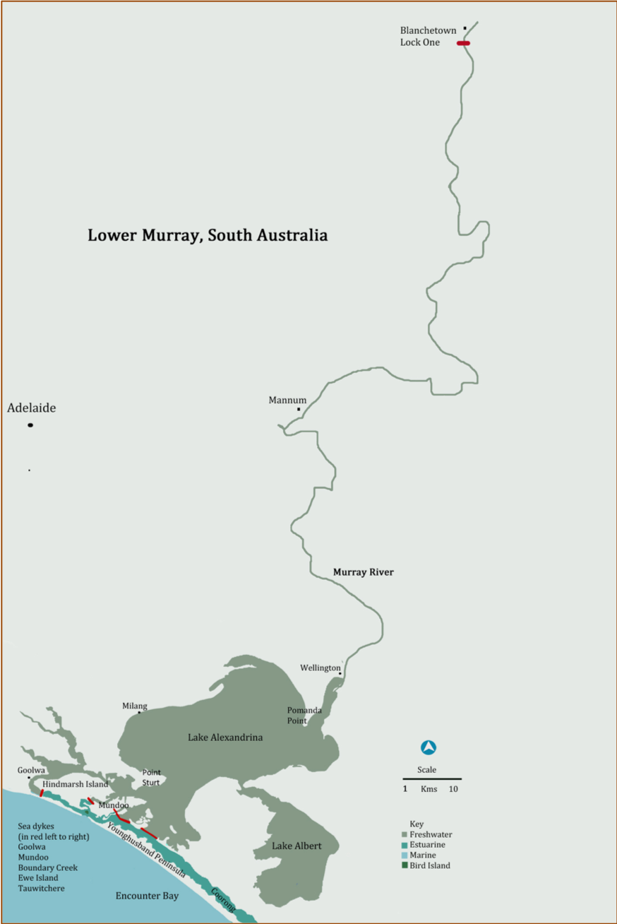 The Murray River’s estuary was formed 7,000 years ago during a period of rapid sea level rise. It was in an intermediate stage of evolution with the central lagoon developing from intermittently closed to fully tidal, when in the 1930s, sea dykes/barrages were built between the island, just to the north of the sand peninsula and the narrow entrance to the Southern Ocean.