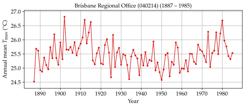 It is the case that for some Australian locations there are long consistent records through much of the twentieth century. For example, temperature data recorded at Brisbane (station number 40214) are currently publicly available from January 1887 to March 1986. This is one of the longest continuous high quality temperature records for anywhere in the Southern Hemisphere with measurements taken using the same mercury thermometer at the same place every day (although the Glaisher stand was replaced with a Stevenson screen in 1896).