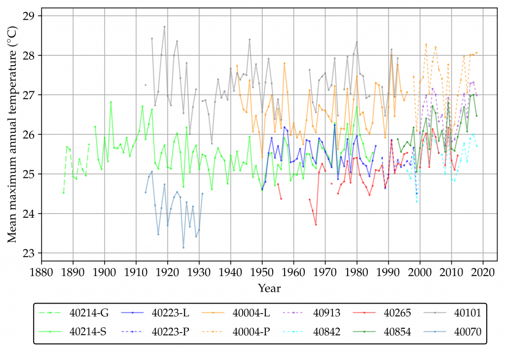 Consistent with many other such high-quality and long continuous records from Australia, this maximum temperature series shows cooling to about 1960 and then warming.