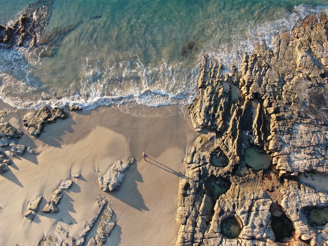 The photograph is of me, and some potholes etched into Tea Tree Bay, Noosa National Park, and was taken with my new drone (Skido) in June 2019.
