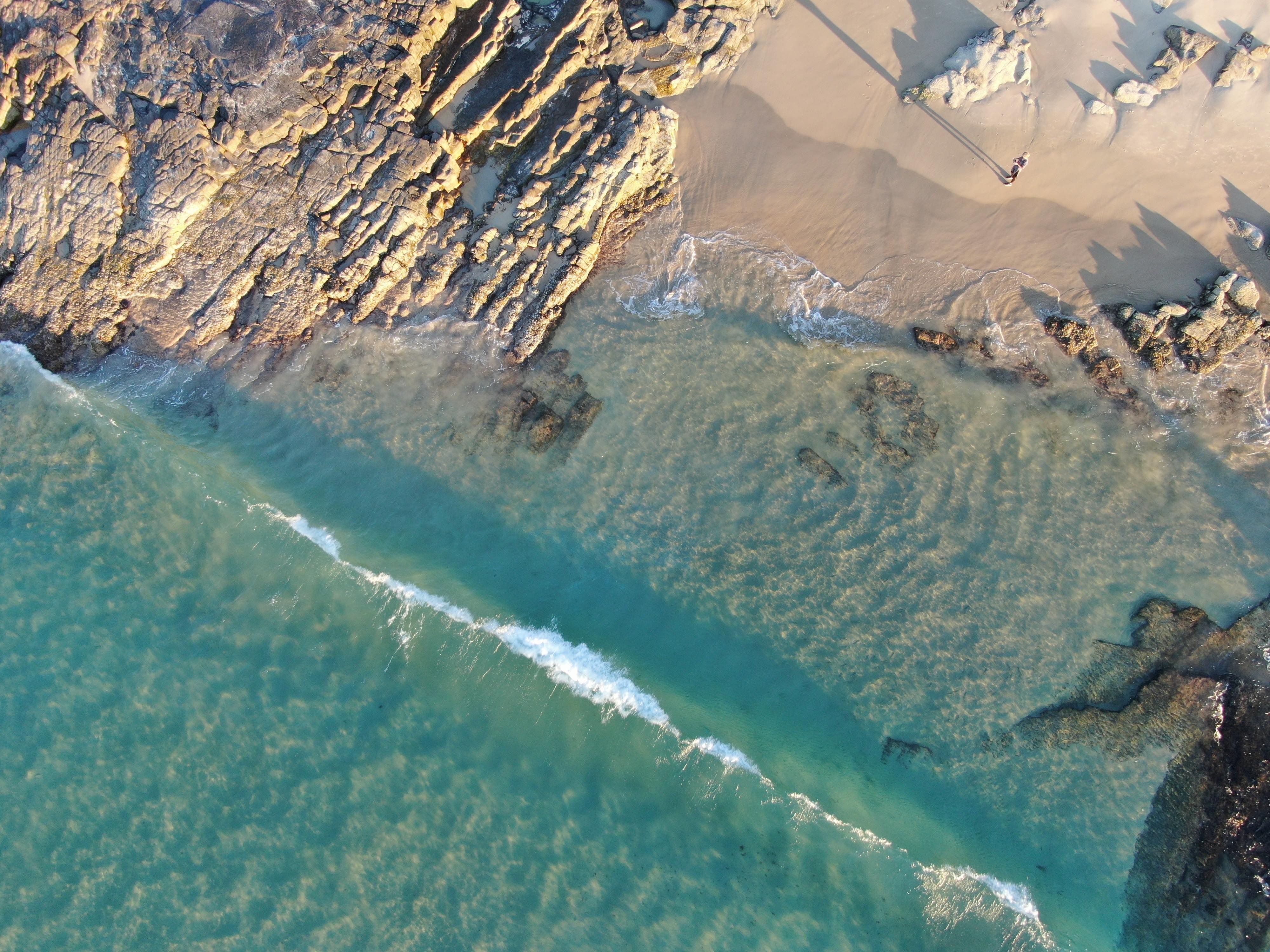 These rock pools are known as potholes by geologists. This photographs was taken from my drone late in the afternoon, to the north of Tea Tree Bay, Noosa National Park. Can you see me in the photograph … I’m there, looking up?