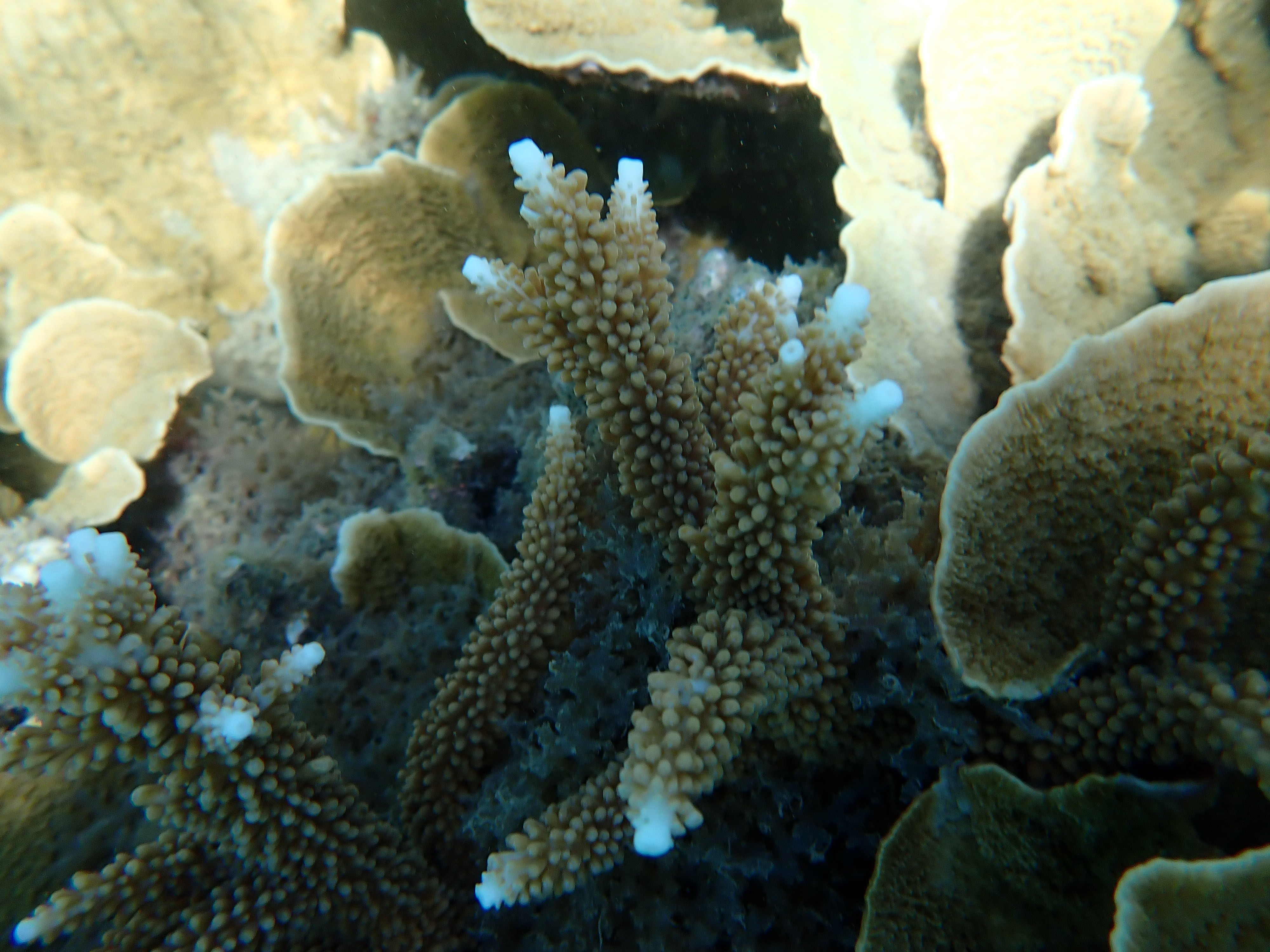I visited Stone Island late August, and was surprised to find an abundance of Acropora spp. forming both plate and branching colonies. I saw and photographed large pink plate coral on 25th August — some more than 1 metre in diameter — at the reef edge just 30 metres from where Tara Clark and colleagues ended their transect as published in Nature.