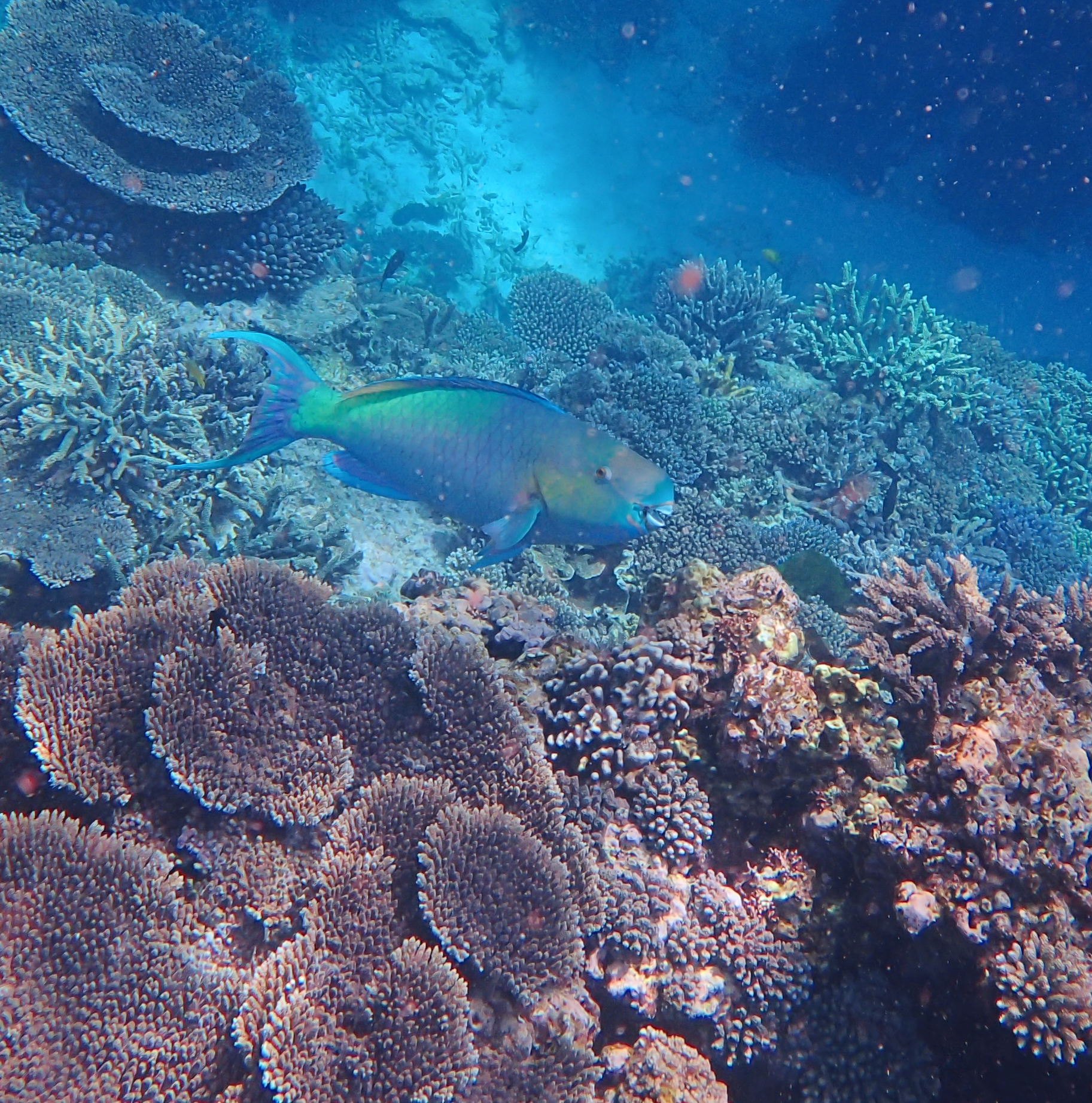 For those who have never snorkelled or scuba-dived, and who like to lament the dying Great Barrier Reef, the corals beyond the parrot fish in Jessica’s picture might all look bleached. But that is how corals look in the distance when visibility is good, because the water is so clear. It is only when you swim up to them, when you are nearer to the corals, that you can see their real colour.