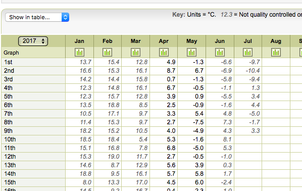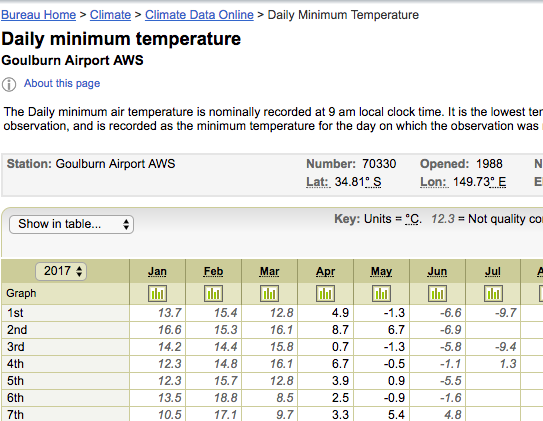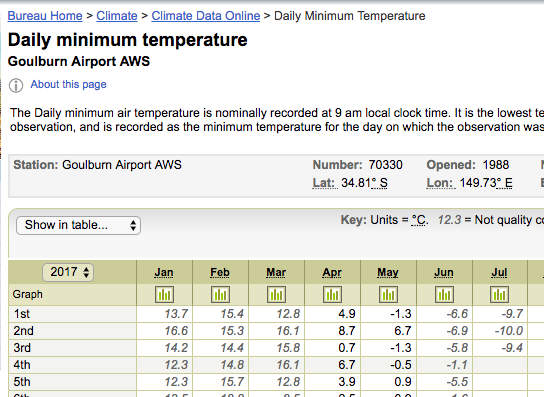 However, the Bureau has so far not updated the key CDO Online database, the official record of temperatures for Goulburn airport.  This is the dataset used to calculate regional, national and global temperatures.  Rather than replace the bogus -10.0 degree Celsius with the correct -10.4, they are leaving a blank.   Not good enough.