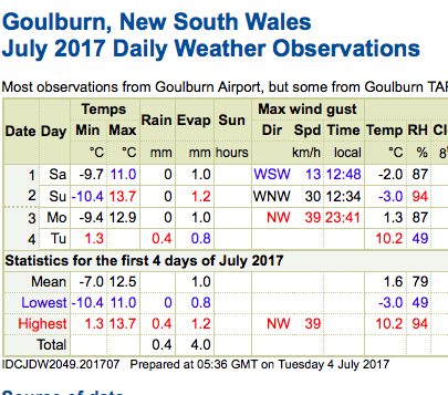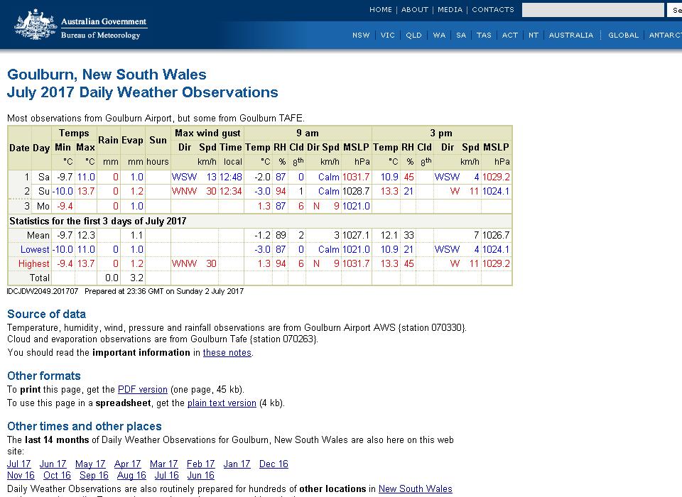 Bureau Erases Goulburn Record Minimum Temperature: Set Sunday 2 July 2017