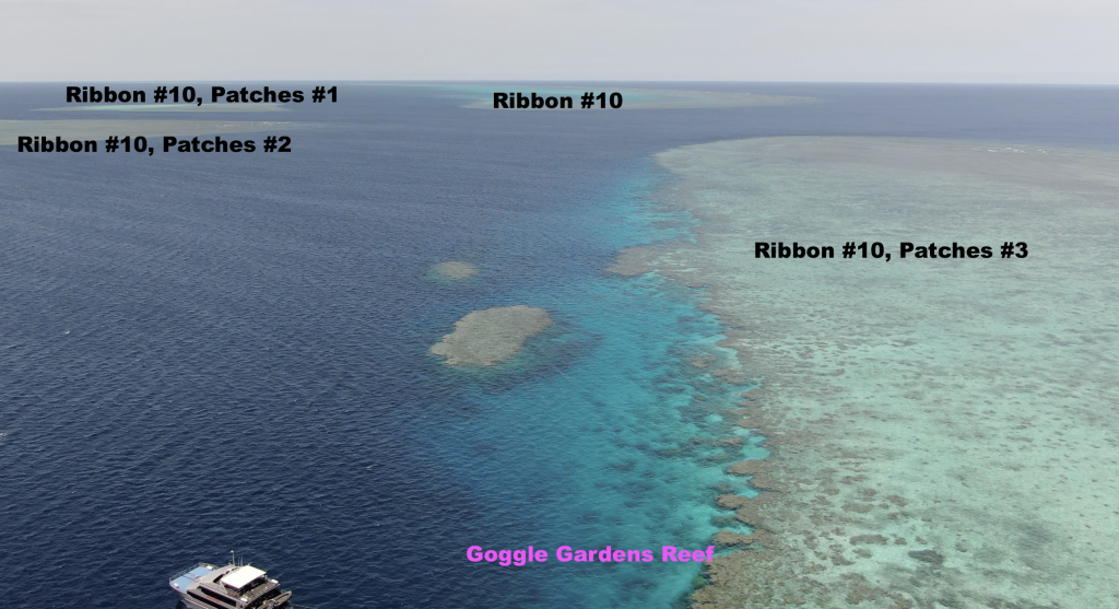 Ribbon Reef No. 10 is the longest of these most northern outer barriers with an inside (westerly-facing) edge that drops to 40 metres and an outside (easterly-facing) edge that drops vertically to 2,000 metres. This Ribbon also has what are called ‘Patches’, as shown in the screen shot from drone footage.