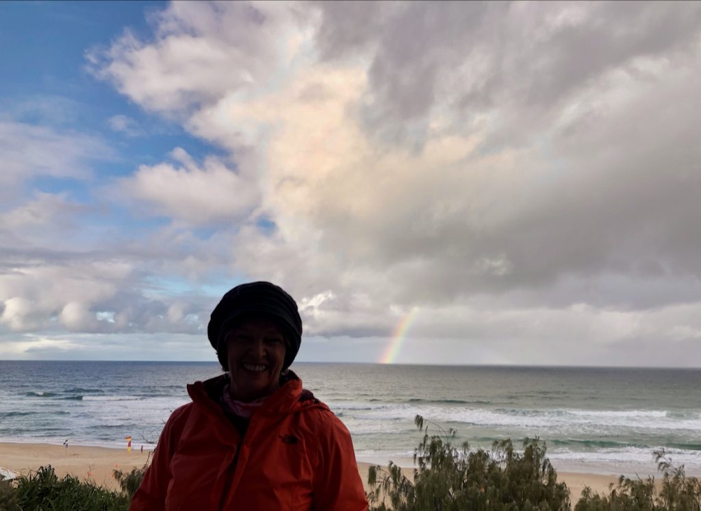 Me, and a rainbow on the horizon, visible from the Sunshine Beach Surf Club just a few days ago. Still in 2020 there are rainbows.