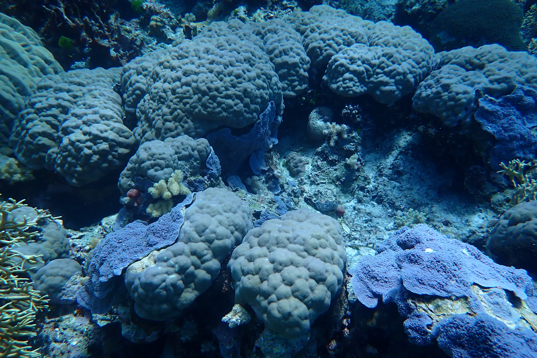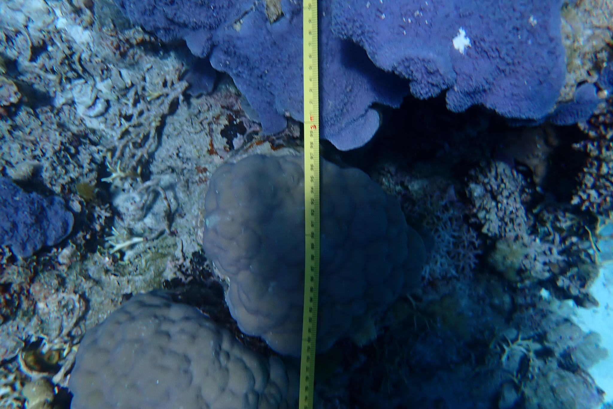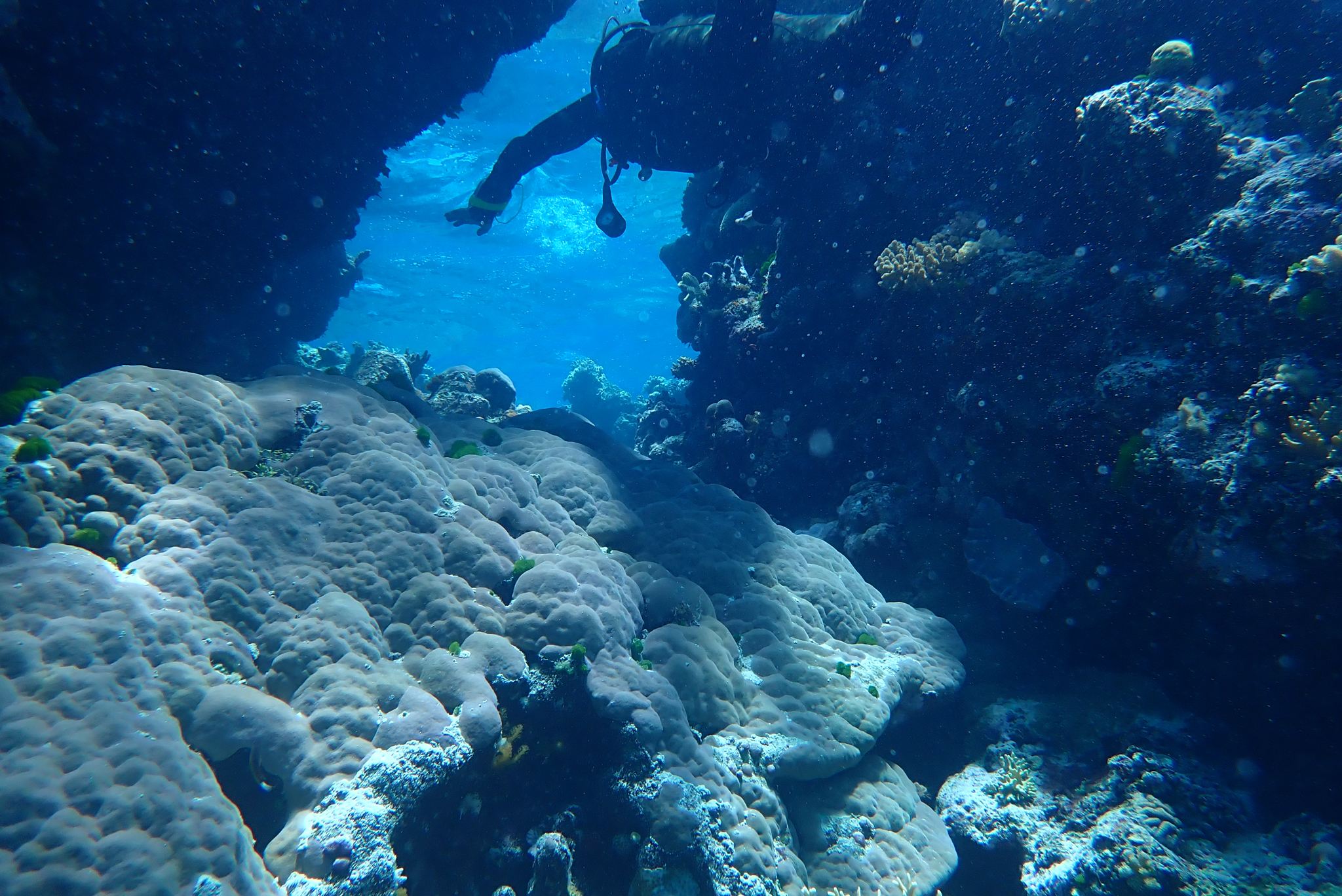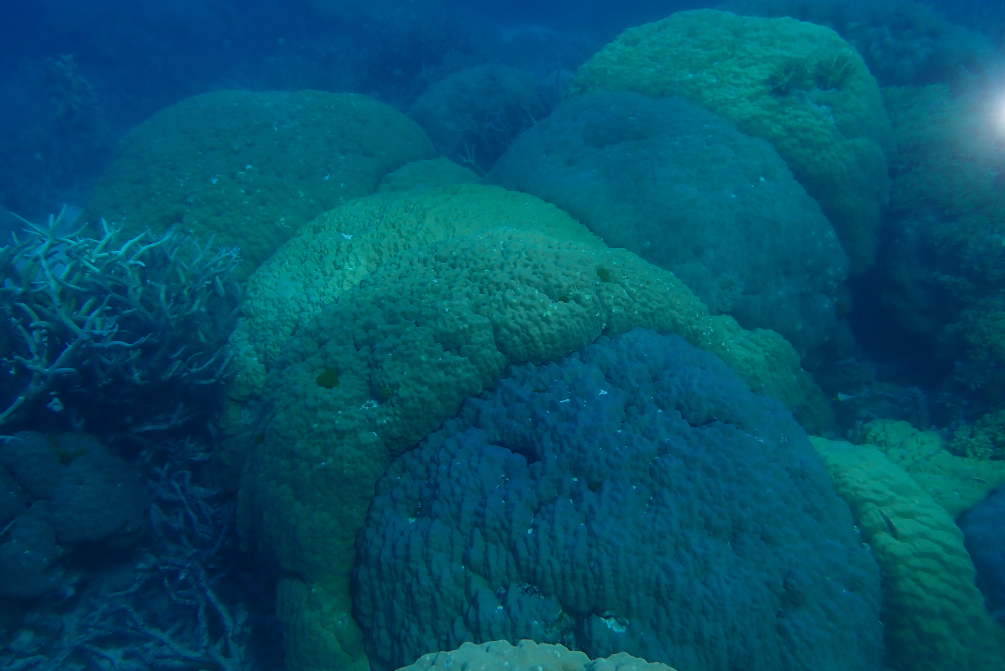 Shaun Frichette swimming over massive Porites on 1st December 2020.