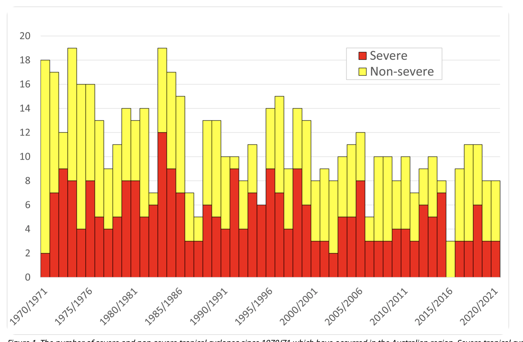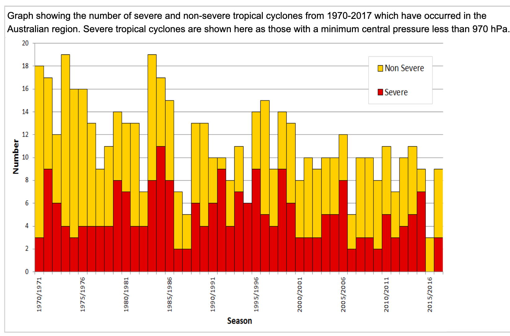 The Bureau has not updated this chart since the 2016/2017 season. The trend continues a downward trajectory with just 8 tropical cyclones last season (2020/2021) with 3 categorised as severe. http://www.bom.gov.au/cyclone/climatology/trends.shtml