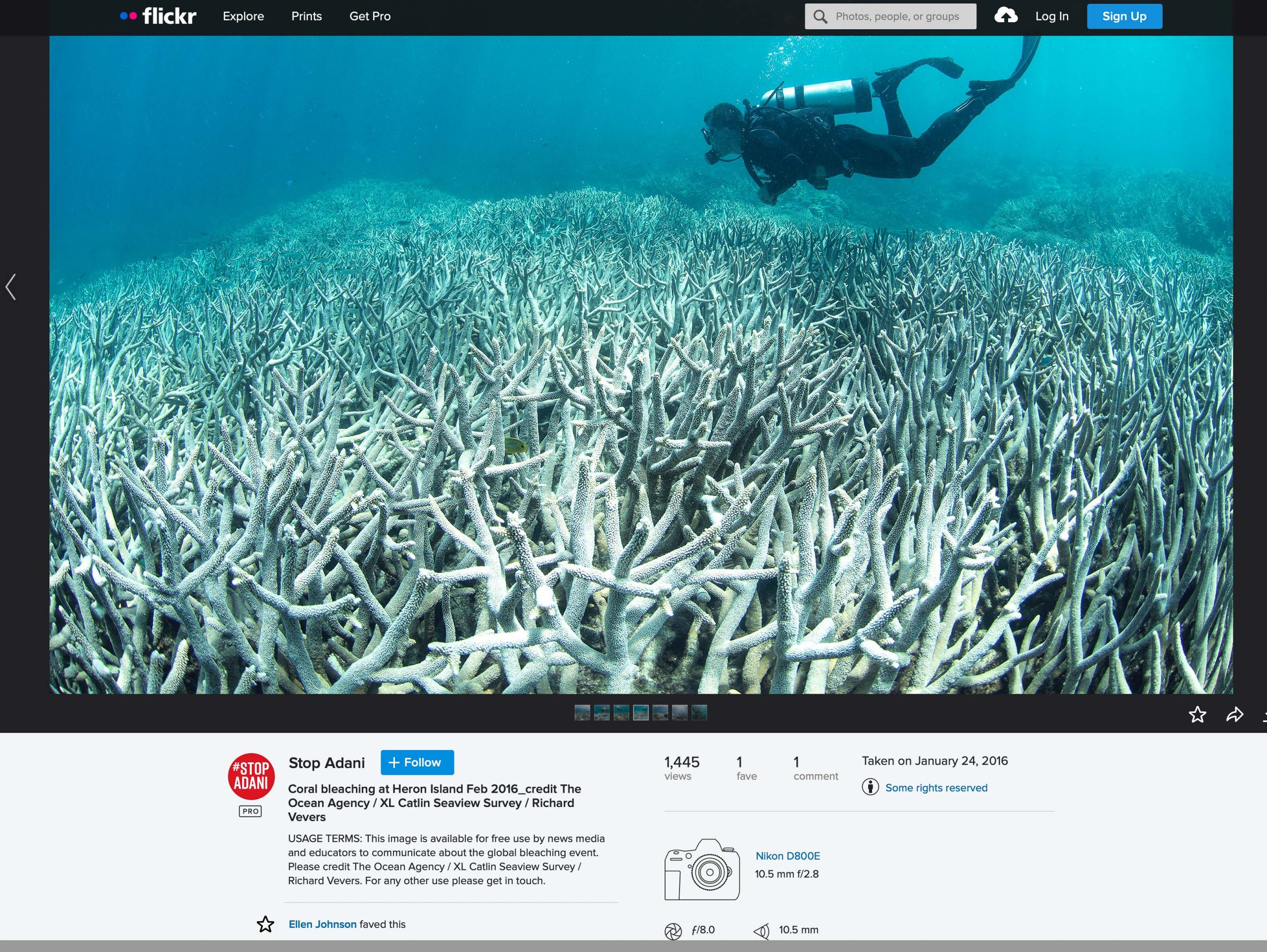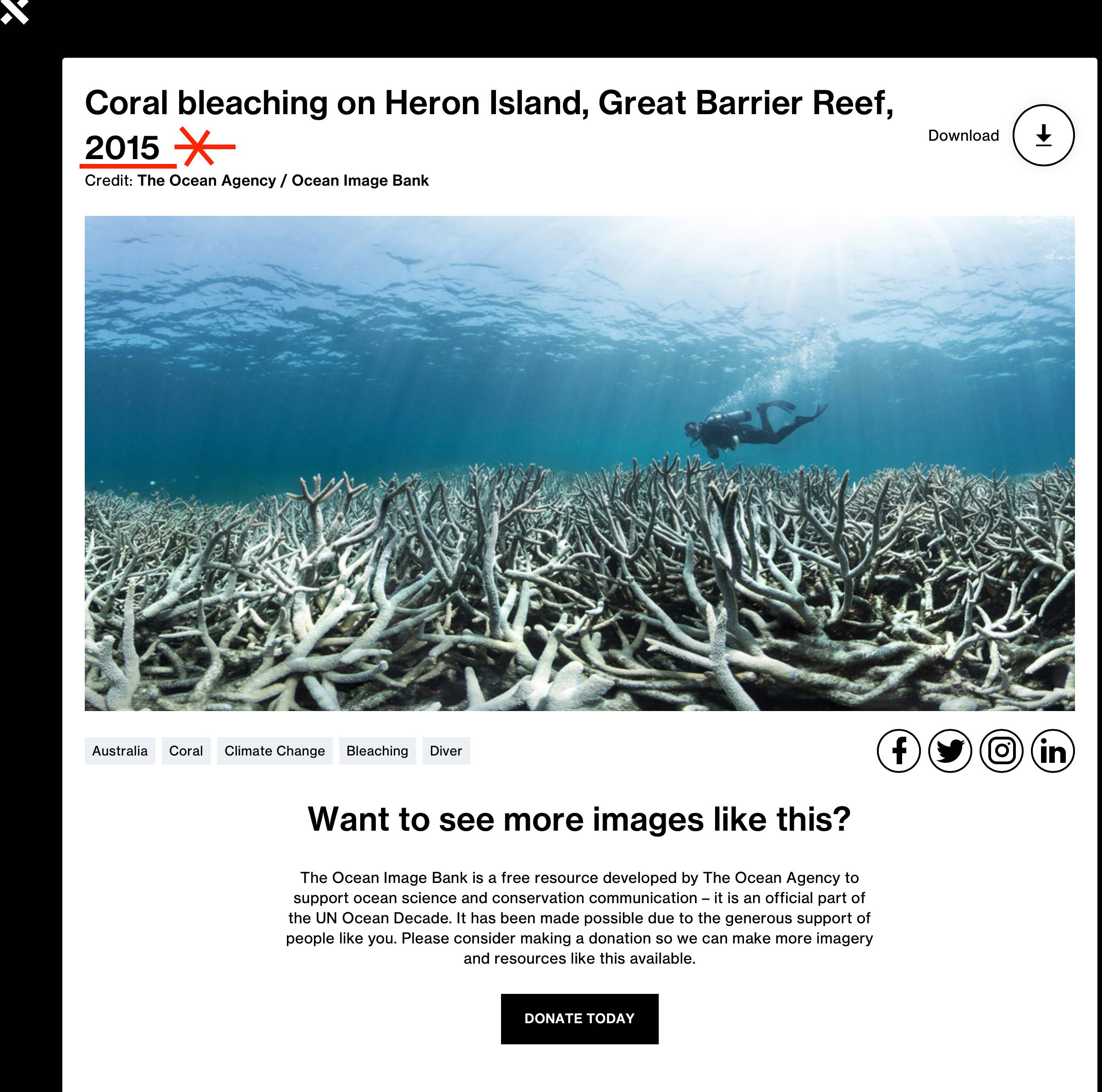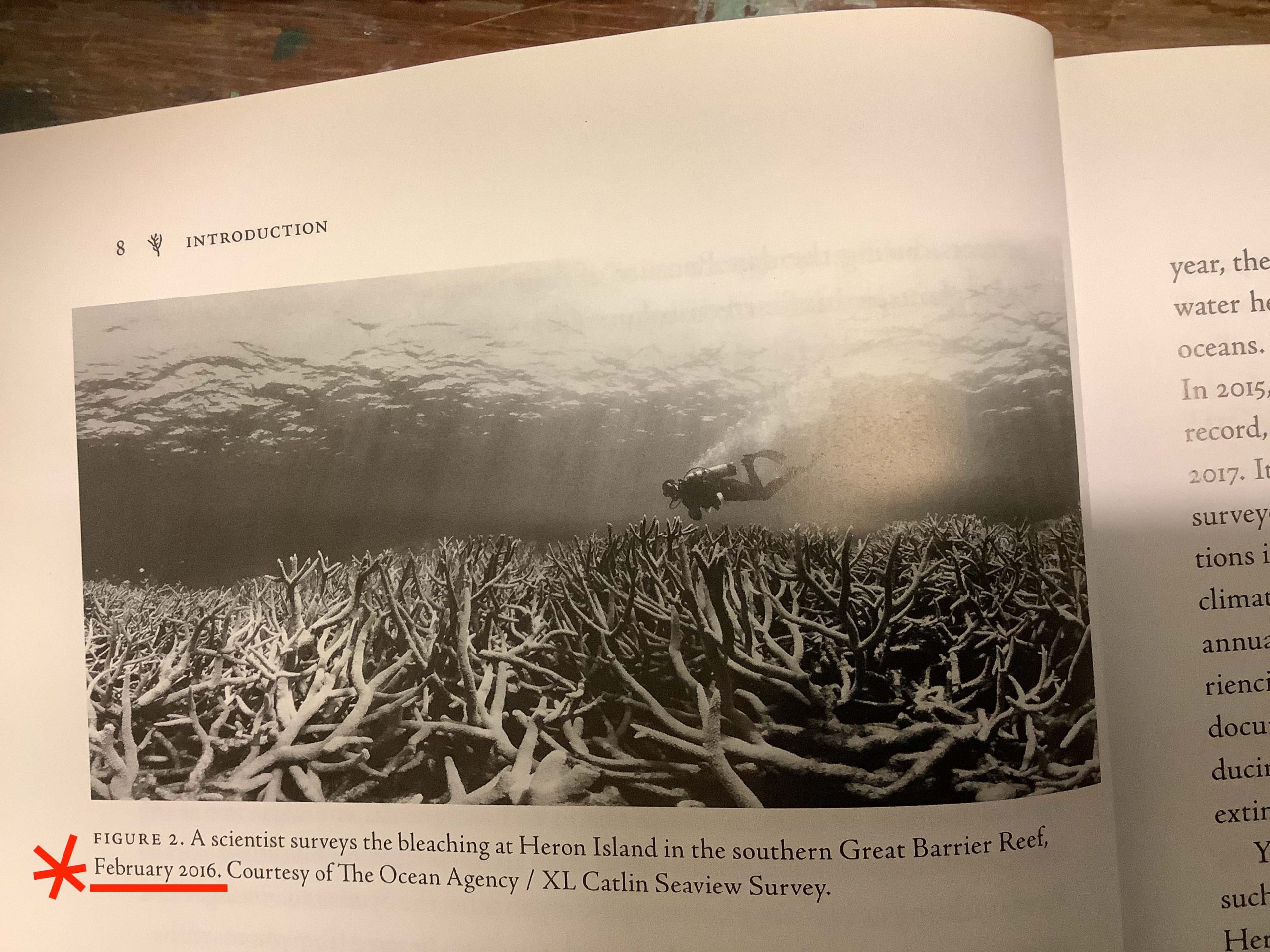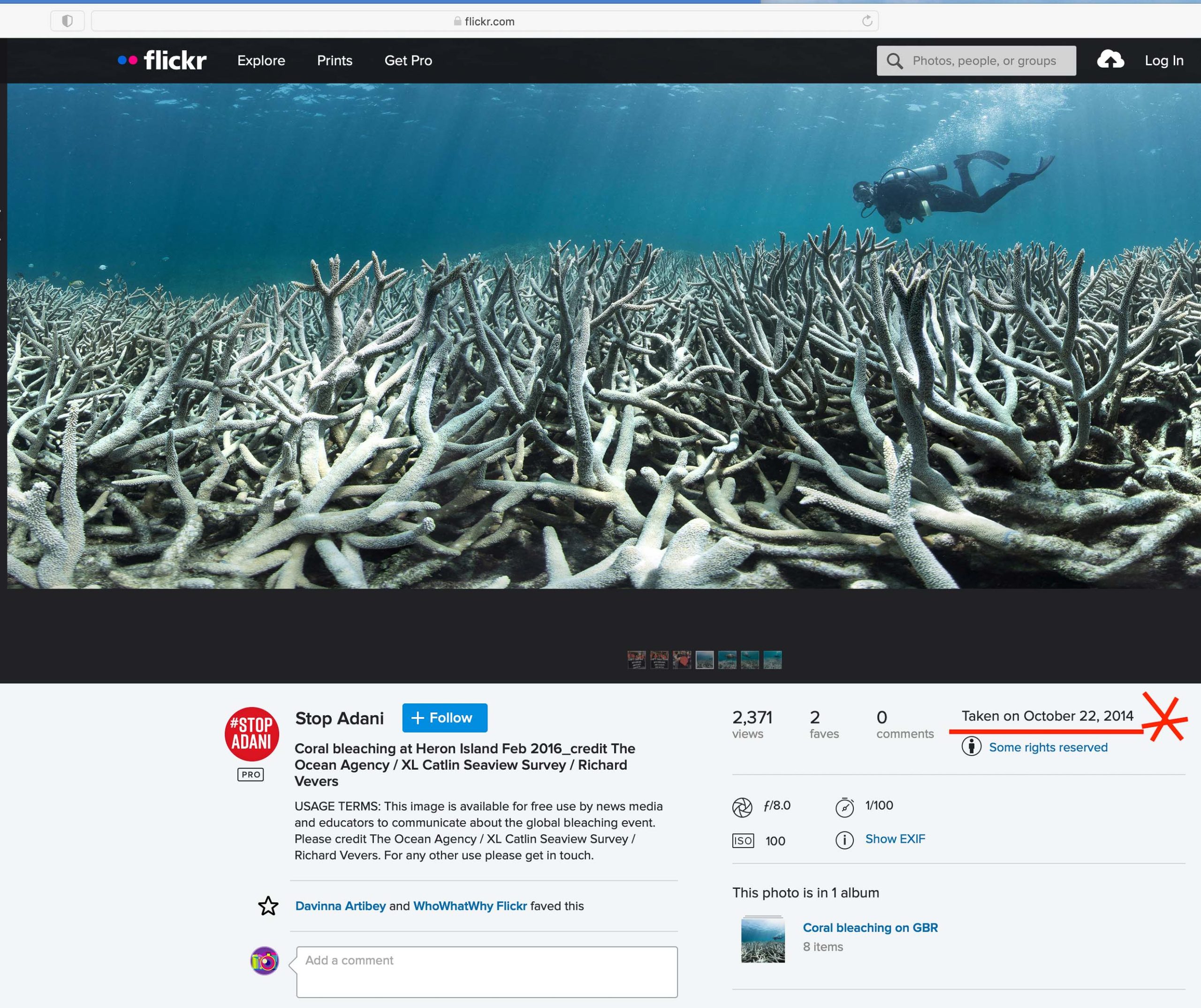 There is a photograph that has been promoted by Richard Vevers, the founder, and CEO of The Ocean Agency, a Washington-based international not-for-profit that is purportedly dedicated to marine conservation. It is described on his The Ocean Agency website as having been taken at Heron Island in 2015. On Flickr, the same photograph is described as having been taken in 2014, and in Irus Braverman’s book Coral Whisperers as having been taken in 2016.