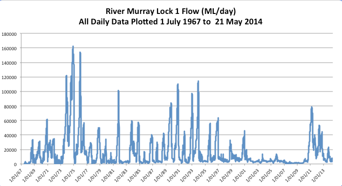 Daily flow data for Lock 1 is available back to 1967, and it shows that while rainfall might be cyclical, flow volume has been in general decline over recent decades. Historic low volumes were recorded at Lock 1 during the Millennium drought. Even with the record rainfall in the Murray Darling during 2010, flow at Lock 1 never reached the heights it did during the early 1990 and was a long way short of the peaks during the early 1970s.