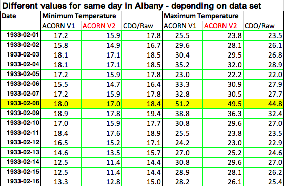There is an interactive table based on the maximum and minimum values as originally recorded for each of the 112 Australian weather stations used to calculate the official temperature values as listed in ACORN-SAT version 1 and version 2 at my website, click here: