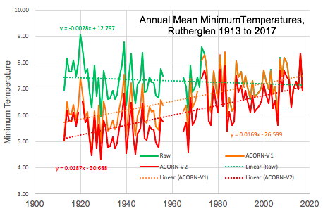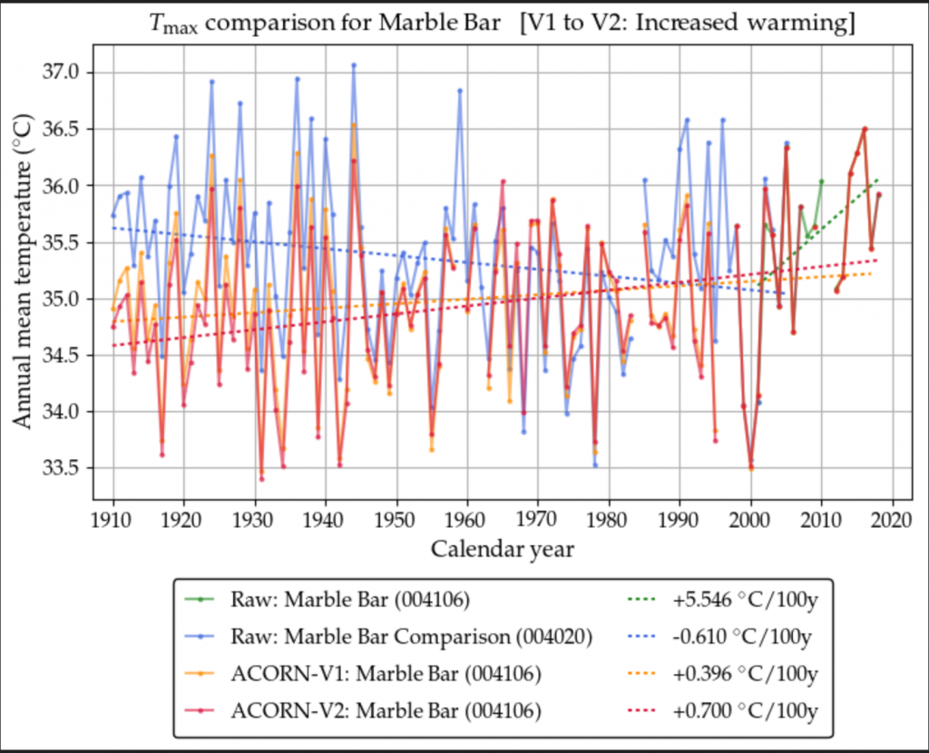 Remodelling of the data sets by the national meteorological services generally involves cooling the past, by way of dropping down the values in the first part of the twentieth century. This is easy enough to check for the Australian data because it is possible to download the maximum and minimum values as recorded at the 112 Australian weather stations for each day from the BOM website, and then compare these values with the values as listed in ACORN-SAT version 1 (that I archived some years ago) and ACORN-SAT version 2 that is available at the BOM website. For example, the maximum temperature as recorded at the Darwin weather station was 34.2 °C on 1 January 1910 (this is the very first value listed). This value was changed by Blair Trewin in the creation of ACORN-SAT version 1 to 33.8 °C. He ‘cooled’ this historical observation by a further 1.4 °C in the creation of ACORN-SAT version 2, just in time for inclusion in the values used to calculate a global average temperature for AR6. When an historic value is cooled relative to present temperatures, then an artificial warming trend is created.