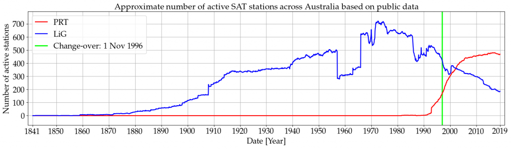 As shown in the figure below, the LiG thermometers were gradually replaced by PRTs, starting soon after 1990. As this new technology was phased in, the older thermometers were still used to measure and log the daily temperature values in a number of weather stations. Initially, the LiG thermometers were given preference at these sites, but on 1 Nov 1996 the electronic thermometer became the official measurement device. In weather stations where both technologies were used, the value read from the electronic sensor was taken as the official temperature from this date – suggesting that the two thermometers did not measure the same value.